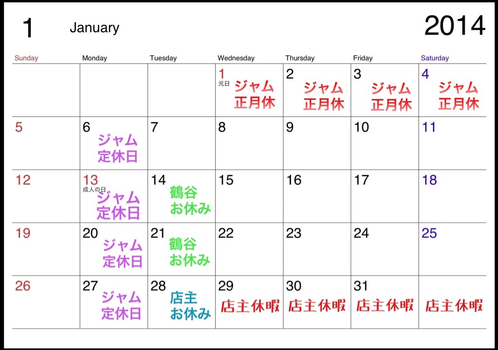 店主 1月の お休み追加 と ジャムの2月のスケジュールのお知らせです! 2014年01月25日 20:31 曼谷の情勢が只今不安定で有りますので お知らせがギリギリになりましたこと お詫び申し上げます。 店主 上記の予定で冬季休暇を頂きます。 留守中はご迷惑をお掛けしますが 最強の美女コンビ!魅惑のスタイリスト二人が 鬼の居ぬ間に のびのびと 仕事をしております。 どうぞ安心してご予約をお入れ下さいませ。 ジャム、2月の初めの火曜日 4日は お休みでございます。 月曜と連休ですのでお間違いの無いように お願い致します。 「ニュースレター」カテゴリの最新記事 「告知」カテゴリの最新記事 < 前の記事次の記事 > コメント コメントフォーム 名前 コメント 評価する リセット リセット 顔 星 投稿する 情報を記憶 トラックバック