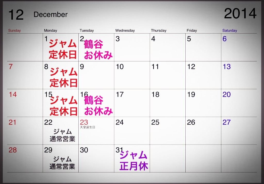 定休日のお知らせと 好評企画 ジャムの福袋! 2014年11月30日 16:38 明日は ジャムの定休日です! 火曜日 鶴谷はお休みですが 店主が通常営業しております。 午後からのご予約をお待ちしております。 O様 頑張って 髪質改善しましょうね! きっと キレイな髪になりますから‼️ ついでにおはだの角栓も ゴッソリ 取っちゃお。 フリーチョイスの福袋 お買い上げです。 。・°°・(>_<)・°°・。 「ニュースレター」カテゴリの最新記事 「告知」カテゴリの最新記事 < 前の記事次の記事 > コメント コメントフォーム 名前 コメント 評価する リセット リセット 顔 星 投稿する 情報を記憶 トラックバック