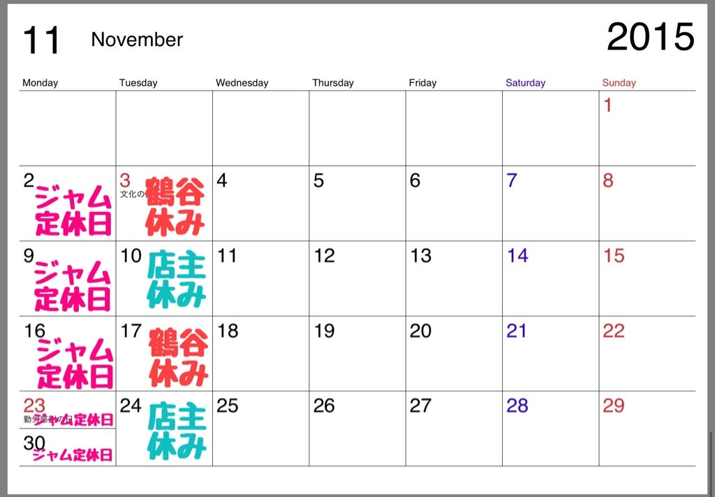 ジャム 11月のスケジュール。